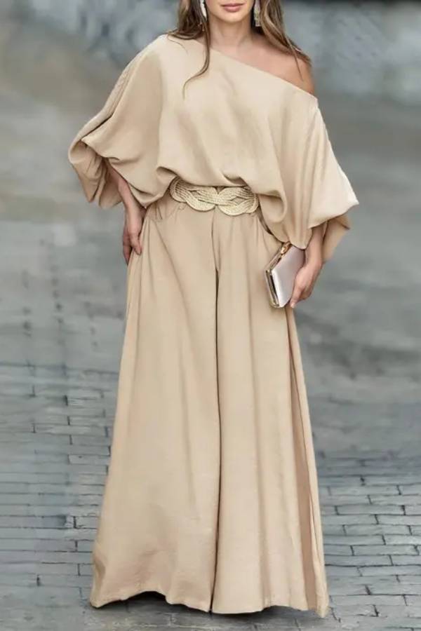 Skew Neck Lantern Sleeve Top & Wide Leg Pants Set